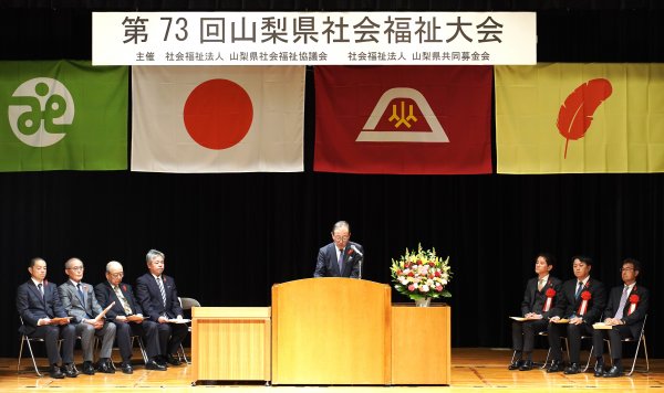 令和7年11月26日、第73回山梨県社会福祉大会を開催しました。表彰では中央共同募金会会長感謝楯・感謝状の伝達を行い、甲府市役所職員一同を代表して、甲府市福祉部長 輿石和三様がご出席くださいました。受賞された皆様は次のとおりです。ありがとうございました。