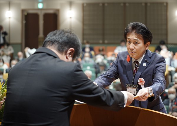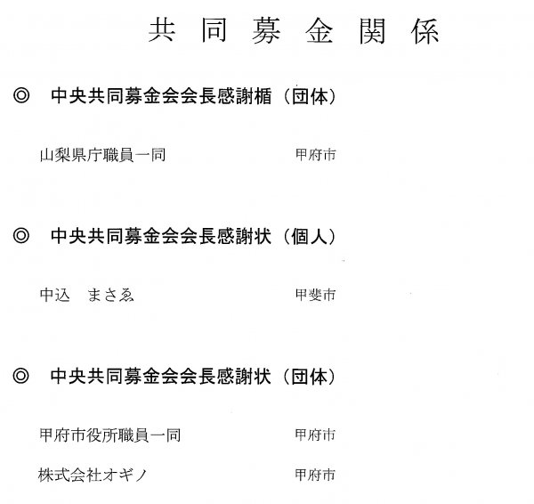 令和7年11月26日、第73回山梨県社会福祉大会を開催しました。表彰では中央共同募金会会長感謝楯・感謝状の伝達を行い、甲府市役所職員一同を代表して、甲府市福祉部長 輿石和三様がご出席くださいました。受賞された皆様は次のとおりです。ありがとうございました。